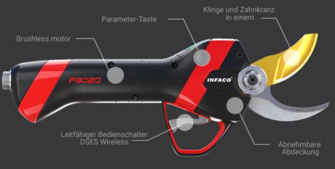Seit über 35 Jahren stellt INFACO Akku-Astscheren für den professionellen Anwender im Bereich Weinanbau, Baumpflege (Obstbau, Forstwirtschaft) u. Grünflächen her. Das neue Modell F 3020 ist die 9. Generation. Mit dem serienmßig ausgerüsteten SicherheitssystemDSES verfügt die F 3020 über eine elektro-nische Sicherheitsvorrichtung als Alleinstel-lungsmerkmal. Die F3020 ist ein würdigerNachfolger der F 3015.